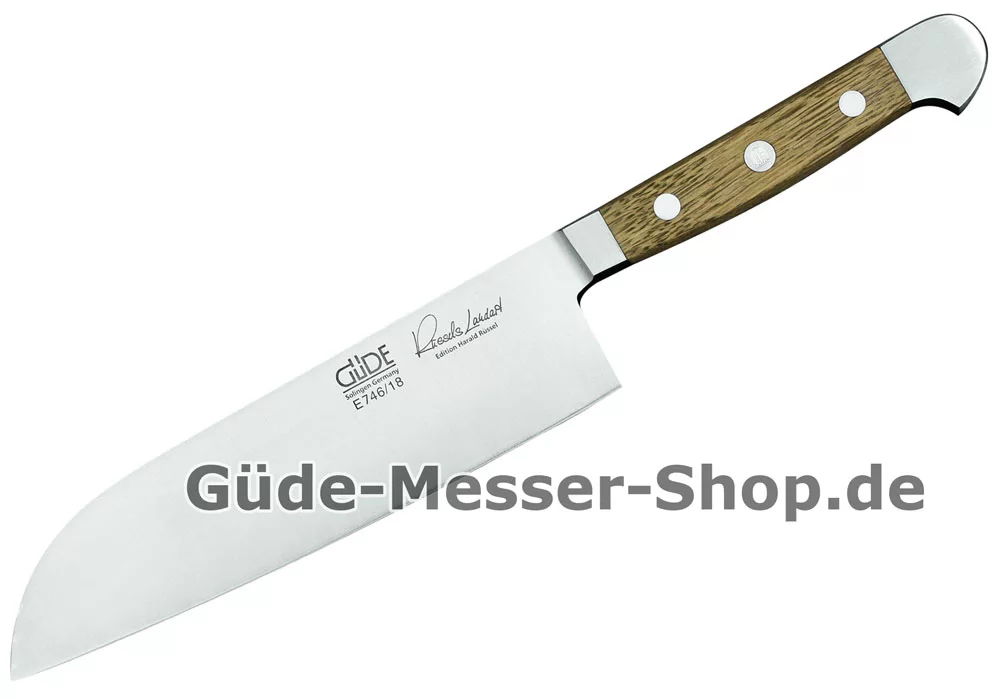 Santoku gibt es in der beliebtesten Güde Messerserie Alpha auch in der langen Version mit 18 cm Klingenlänge. Diese langen Santoku sind für Profis die erste Wahl. Mehr dazu erfahren Sie unter Santoku. Auch diese japanischen Kochmesser werden in Solingen traditionell in Handarbeit hergestellt. Die 58 HRC harten und rostfreien Klingen sind extrem scharf geschliffen.
